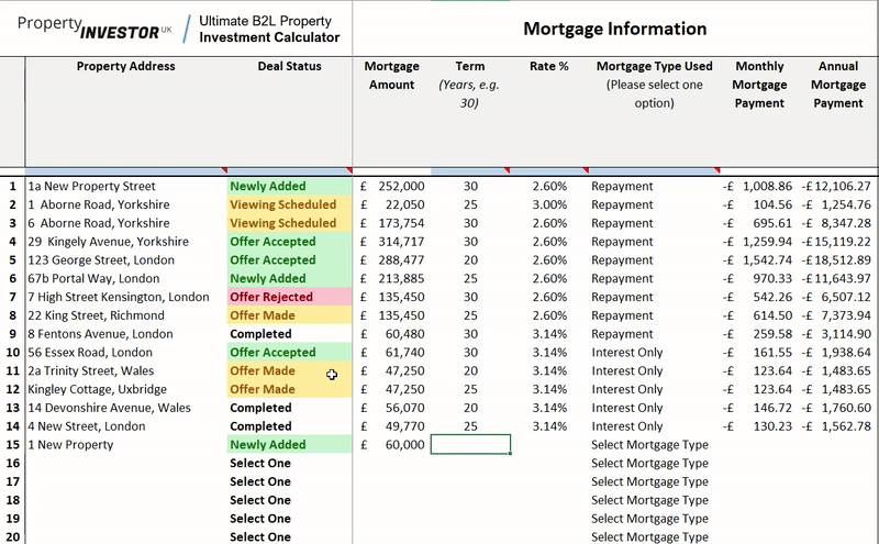 Our Excel-based Buy-to-Let property investment calculator allows you to manage and track up to 100 deals with ease. Our user-friendly interface lets you add and edit deals effortlessly, so you can keep your investments organized and profitable.
